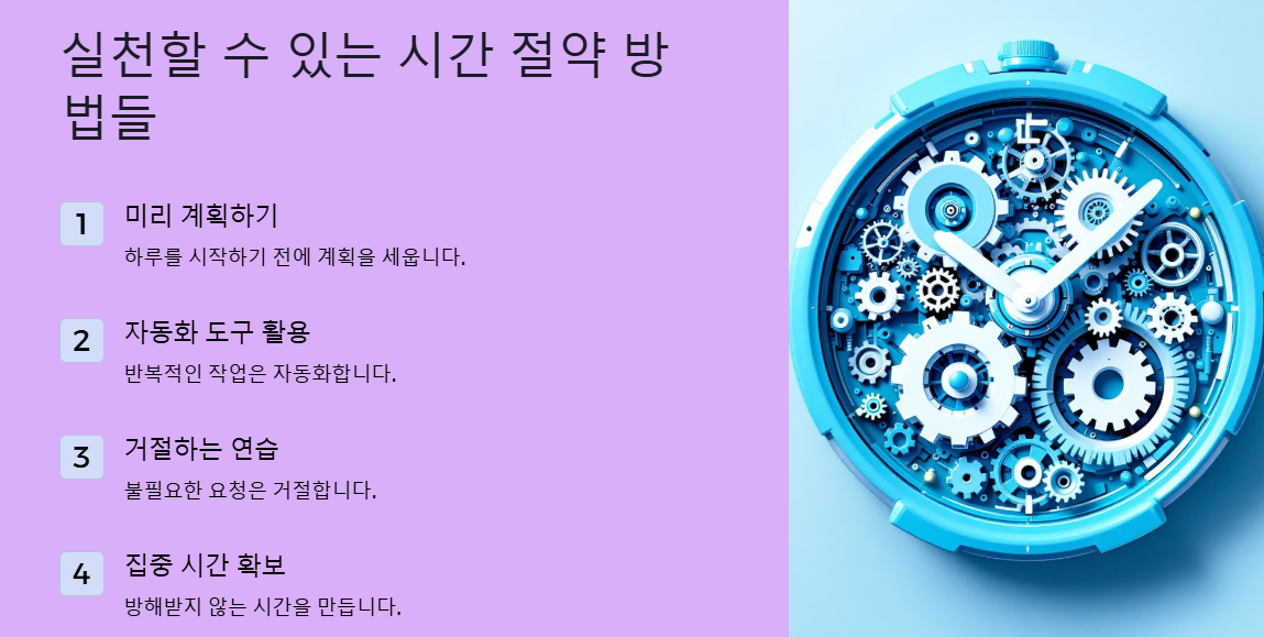 A: 시간 절약을 위해 가장 중요한 것은 계획 세우기와 우선순위 설정입니다. 미리 계획하고 중요한 것을 먼저 처리하면 효율적으로 시간을 관리할 수 있습니다.