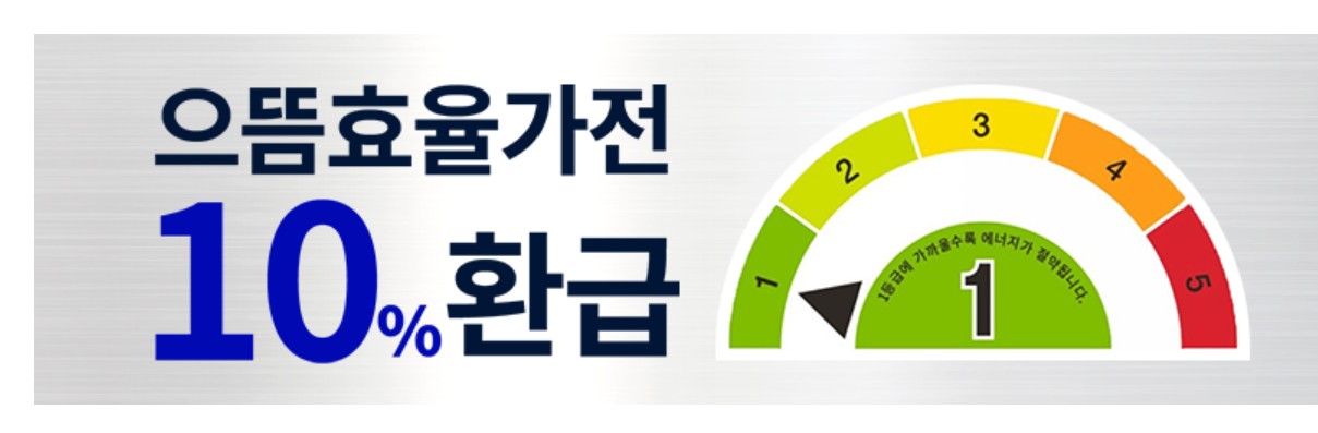 • 2025년 7월 4일부터 에너지 소비효율 1등급(일부 품목은 2등급까지) 가전제품 구매 시 구매가의 10%, 최대 30만 원까지 환급해주는 정부 지원사업입니다.